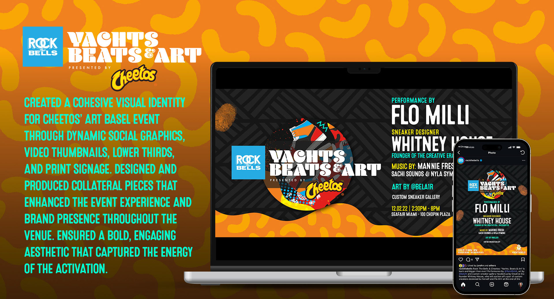 With a clear creative vision, I directed the development of event signage, digital graphics, social content, and branded visuals that captured the bold, flavorful personality of Cheetos while honoring the artistic roots of the hip-hop community. Collaborating with our internal team, I provided design guidance and final art direction to ensure every visual element aligned with the campaign’s playful yet elevated tone.